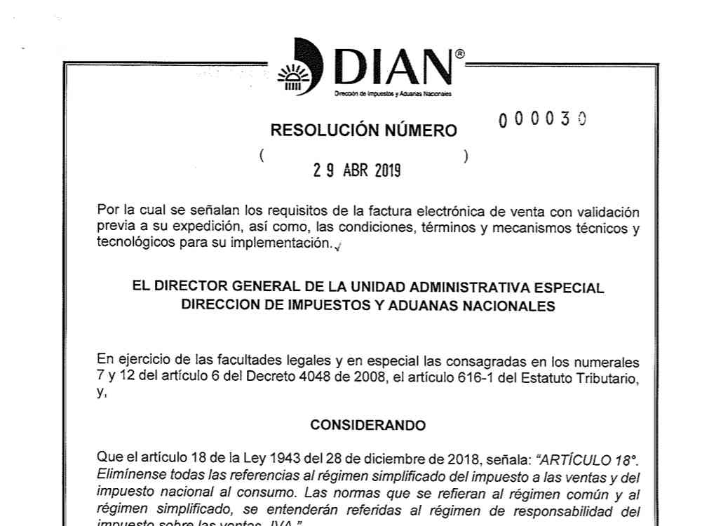 La Resolución 000030 de 2019, la cual estableció los requisitos de la factura electrónica de venta con validación previa, al igual que los términos y mecanismos técnicos para su implementación.