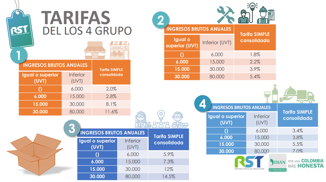 Las tarifas del #RST #RégimenSimpledeTributación dependen del grupo según la actividad económica así: