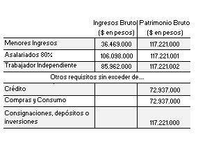 Obsérvese que aunque la norma nos hace diferenciar al universo de las personas naturales en tres distintas subcategorías (es decir, entre “asalariados”, “trabajadoresindependientes” y “las demás personas naturales”), en todas esas subcategorías los valores de la tabla anterior se comportan exactamente igual, a excepción del valor del requisito numero 2 (ingresos brutos).