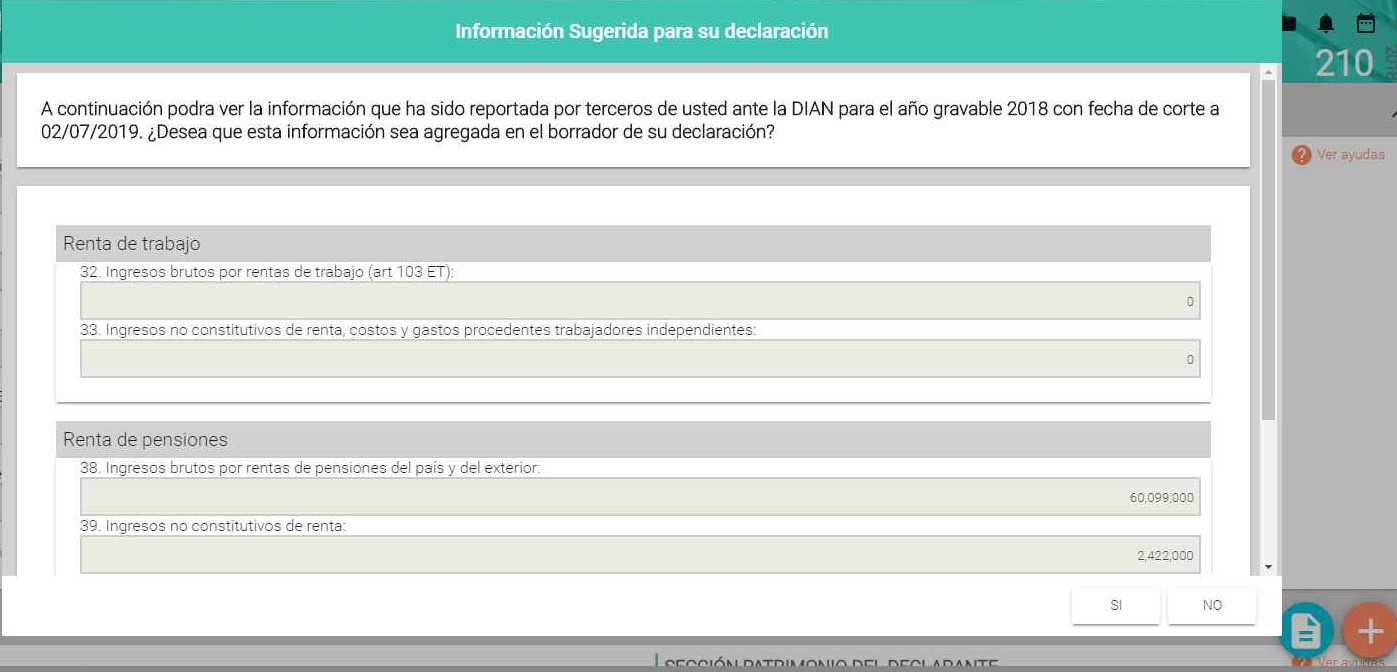 Cabe mencionar, que en este ejemplo, que la información reportada es tomada sin ningún análisis por los sistemas informáticos de la Dian, de tal manera que si usted accede a presentarla de la manera sugerida daría como resultado un saldo por pagar de mas de 4 millones de pesos en impuesto de renta. Tratándose de ingresos consignados en la cédula de rentas de pensiones, el cual tiene un componente exento y debiera ser tenido en cuenta, el sistema no lo tuvo. Adicionalmente, en la sección de patrimonio, el sistema no sugiere nada, lo cual es grave para el contribuyente que desee presentar por su cuenta ya que podría omitir activos y pasivos que obligatoriamente se deben declarar.