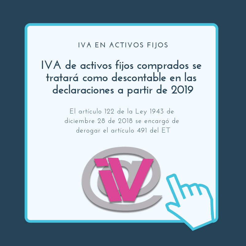 El artículo 122 de la Ley 1943 de diciembre 28 de 2018 se encargó de derogar el artículo 491 del ET, el cual impedía que el IVA de los activos fijos se pudiera tomar como valor descontable. Adicionalmente, la misma ley estableció un nuevo tratamiento fiscal para el IVA de los bienes de capital.