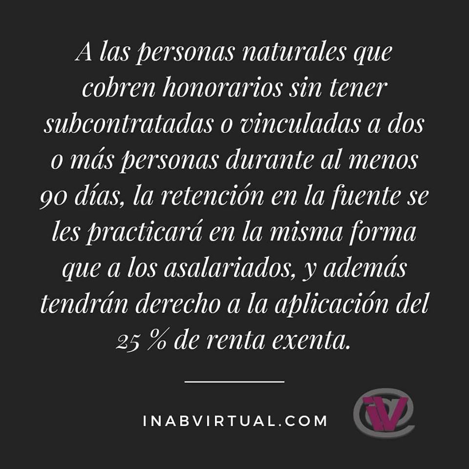 A las personas naturales que cobren honorarios sin tener subcontratadas o vinculadas a dos o más personas durante al menos 90 días, la retención en la fuente se les practicará en la misma forma que a los asalariados, y además tendrán derecho a la aplicación del 25 % de renta exenta.